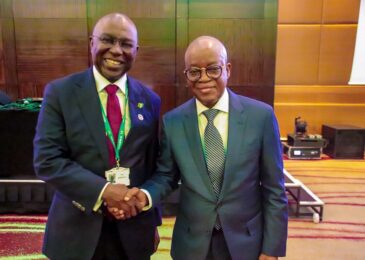 The Director General, Nigerian Maritime Administration and Safety Agency (NIMASA), Dr Dayo Mobereola congratulating the Hon. Minister of Marine and Blue Economy, H.E. Adegboyega Oyetola, CON (right) on Nigeria’s election into the Council of the International Maritime Organization’s (IMO) Council Elections in London.